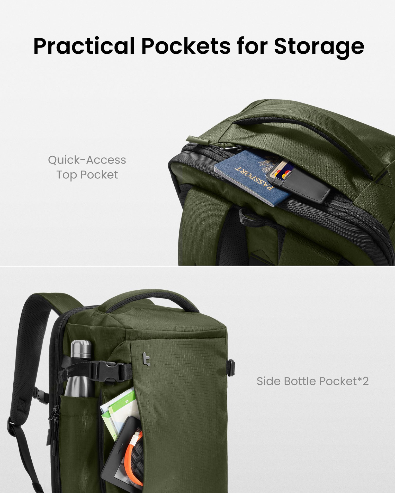 Ngăn chính được thiết kế kiểu vỏ sò, cho phép bạn đóng gói đồ đạc như một chiếc vali, dễ dàng sắp xếp quần áo và các vật dụng lớn. Ngăn đựng laptop chuyên biệt có đệm lót mềm mại, có thể chứa vừa laptop 16 inch và iPad 13 inch. Ngoài ra, các túi phụ phía trước, phía trên và hai bên hông giúp bạn dễ dàng lấy những vật dụng cần thiết như hộ chiếu, ví hay chai nước.