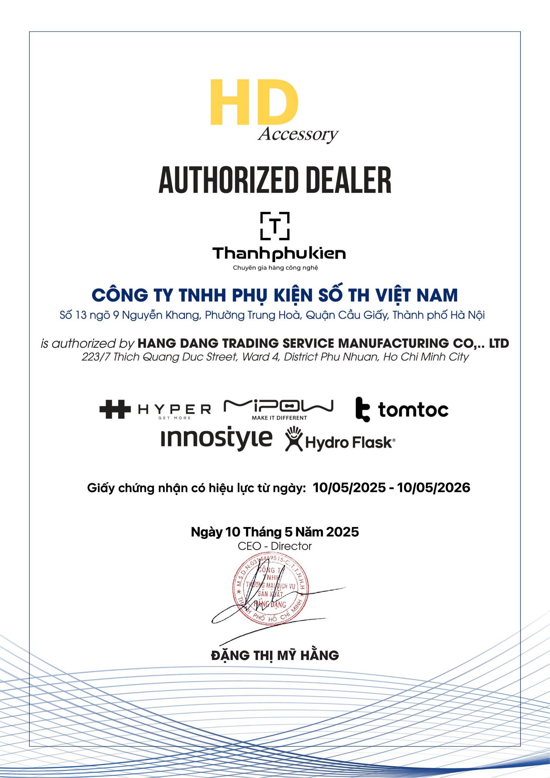 Công ty THNN Phụ kiện số TH Việt Nam- Chủ sở hữu website Thanhphukien.com đã trở thành Đại lý cấp 1 phân phối các thương hiệu Hydro Flask cũng như Tomtoc, Hyper... Hàng hóa có đầy đủ CO, CQ, VAT...vv
