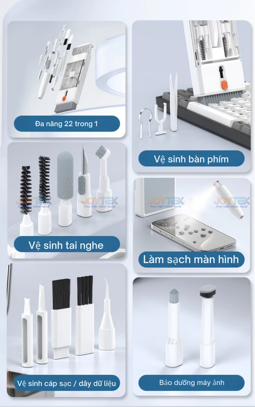 🔧 Bộ vệ sinh 22in1 được thiết kế thông minh với đầy đủ đầu cọ, nhíp, chổi, dụng cụ chuyên biệt giúp: