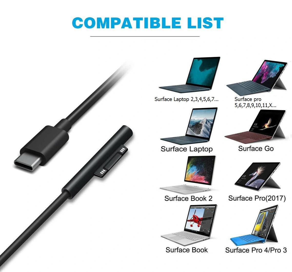 Cáp sạc Type C cho các sản phẩm của Microsoft như Surface Pro 3/4/5/6/7/8/9/10/11, Surfacebook, Surface Laptop, Surface Go....vv