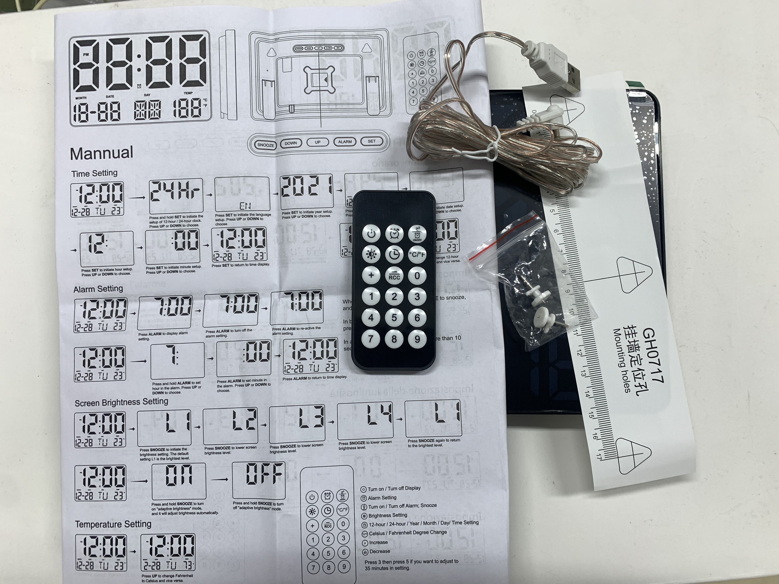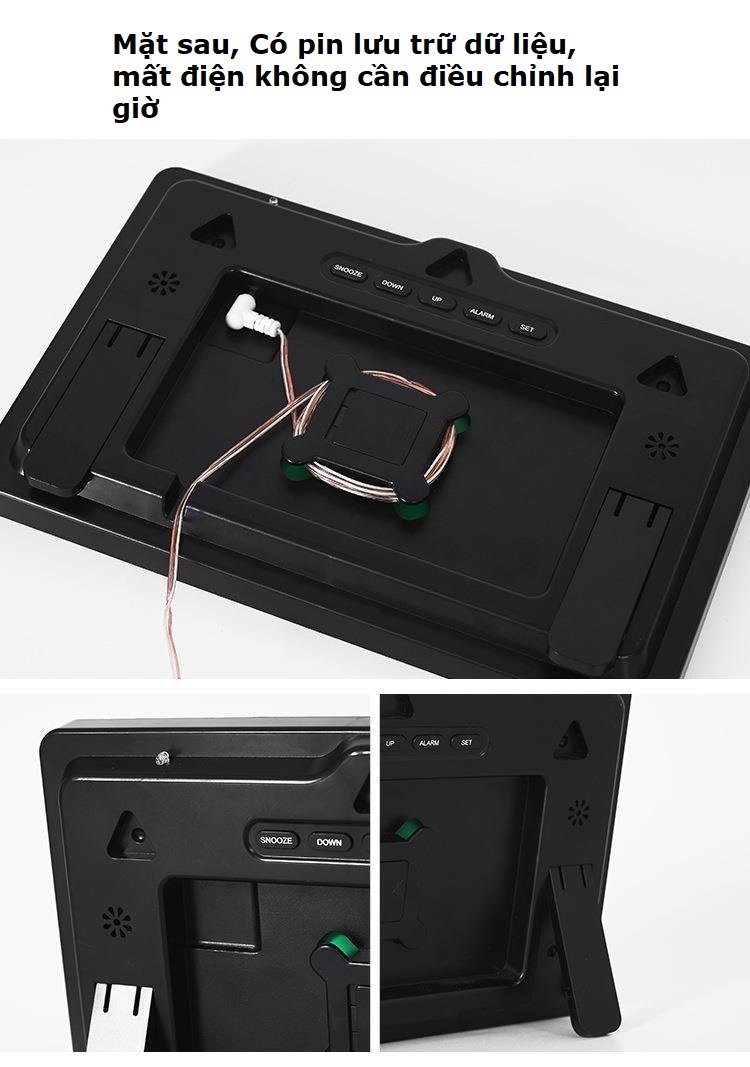 Màn hình lớn, có điều khiển từ xa, có thể điều chỉnh độ sáng, lịch, nhiệt độ, báo lại, 12/24h