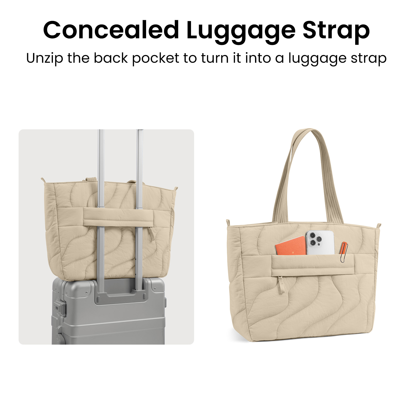 Dây đai vali ẩn (Concealed Luggage Strap): Chỉ cần kéo khóa túi phía sau, chiếc túi sẽ biến thành dây đai giúp bạn gắn chặt vào tay cầm vali khi đi du lịch.